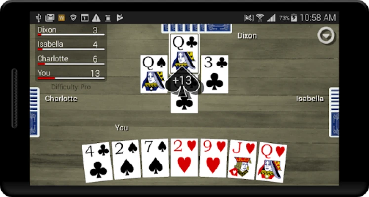 Improve your skills and become a Hearts pro! Hearts Card Classic has three different difficulty settings so you can work your way up to playing like a pro. Statistics are kept for wins and losses and moon shots so you can see yourself improving over time. All cards are dealt randomly to all players, so the difference between the Easy, Standard, and Pro computer players is in how they choose to play the cards they are dealt. A hint button can be turned on to help you see how the computer Pro player would handle your current situation.