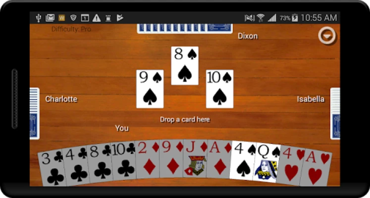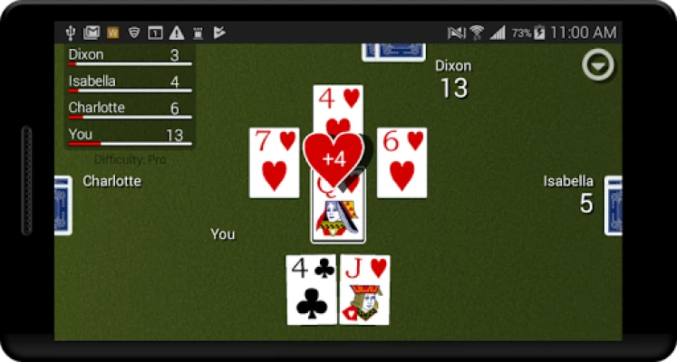 Improve your skills and become a Hearts pro! Hearts Card Classic has three different difficulty settings so you can work your way up to playing like a pro. Statistics are kept for wins and losses and moon shots so you can see yourself improving over time. All cards are dealt randomly to all players, so the difference between the Easy, Standard, and Pro computer players is in how they choose to play the cards they are dealt. A hint button can be turned on to help you see how the computer Pro player would handle your current situation.
